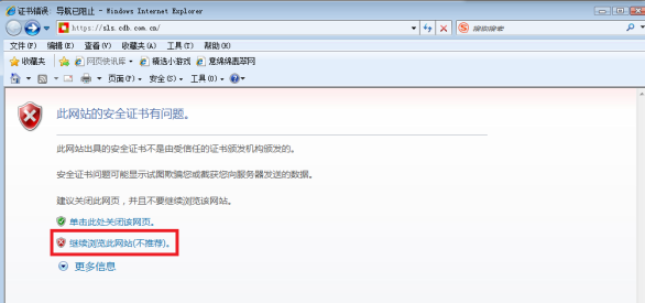 如出现下图“此网站的安全证书有问题”提示,请点击“继续浏览此网站(不推荐)”。