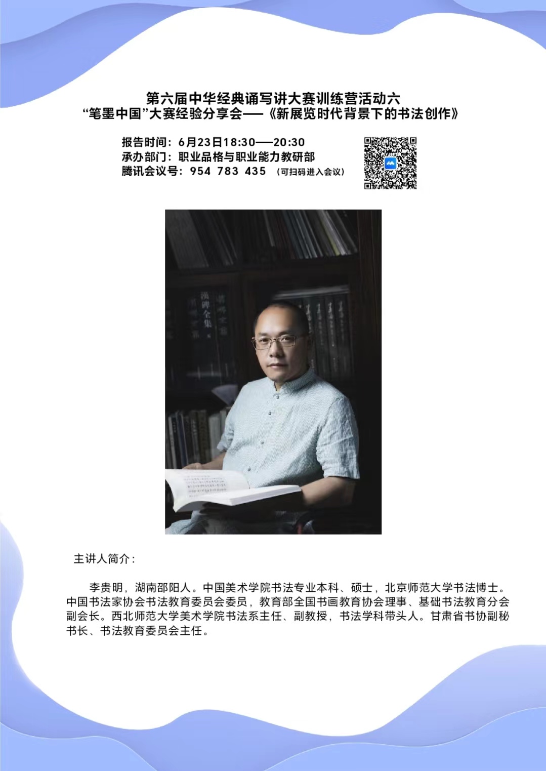 【讲座预告】第六届中华经典诵写讲大赛训练营活动五:“笔墨中国”大赛经验分享会—《如何写出一件满意的书法作品一兼谈书法投稿需要注意的若干问题》
