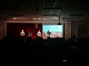 在陈闻悦同学带来的动听的英文歌曲《trouble is a friend》之后,由韩双阳、王宁等同学为我们带来小品《表演我们是认真的》,同学们卖力的演出让会场中阵阵欢声笑语。然后,我们随着薛淇月同学的歌《明天你好》欣赏周莹同学的书法表演。接下来,17级各班团支书上台进行听歌识曲活动,在这项活动中,我们听到了许多在中国共产党的发展过程中有重要意义的红歌。随后,有关“中国共青团、中国社会主义事业和十九大的召开”等问题,我们进行了问答活动。