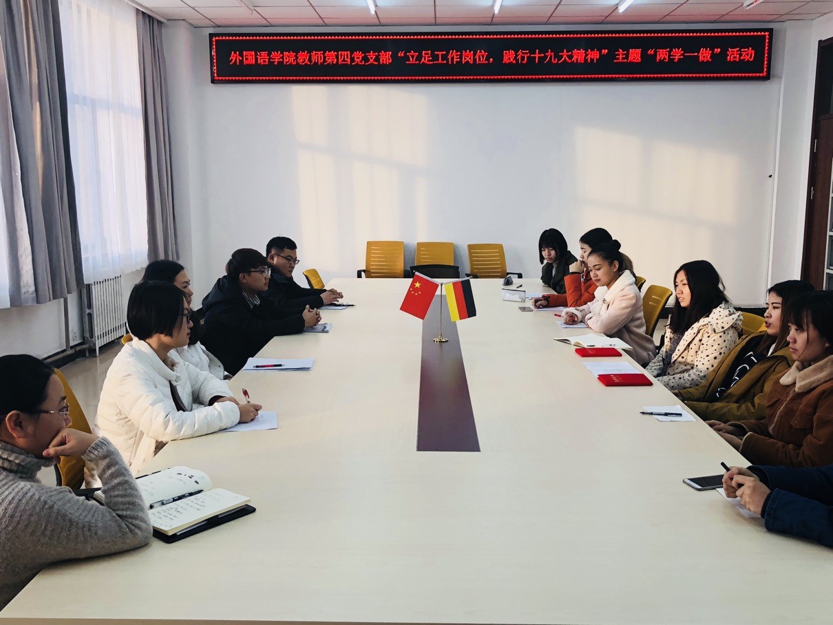 为响应38238a威尼斯欢迎你党委及外国语学院党委对于“两学一做”学习教育常态化制度化精神的要求,为加深教师及学生党员对党的十九大精神的深刻了解,外国语学院教师第四党支部于2017年11月27日在长春校区研发大厦八楼党员活动室举行“立足工作岗位,践行十九大精神”的“两学一做”学习教育。外国语学院德语系教师党员及学生支部教师党员、学生党员(含超考同学)参加了此次活动。