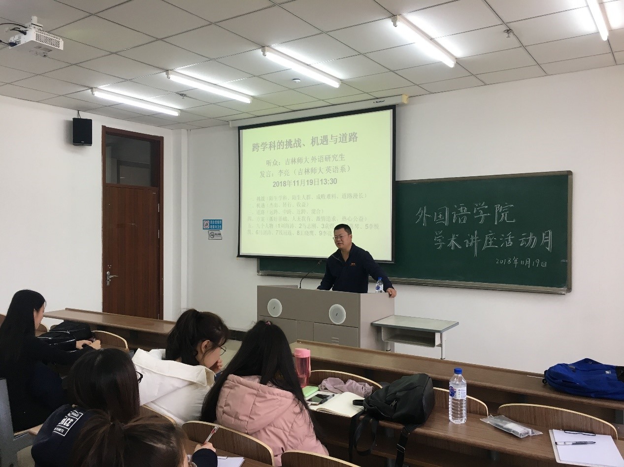 11月19日,在长春校区研发大厦1207室,我院李亮老师为外国语学院2018级英语语言文学专业、英语笔译和英语口译专业研究生做了“跨学科的挑战、机遇与道路”的学术讲座。